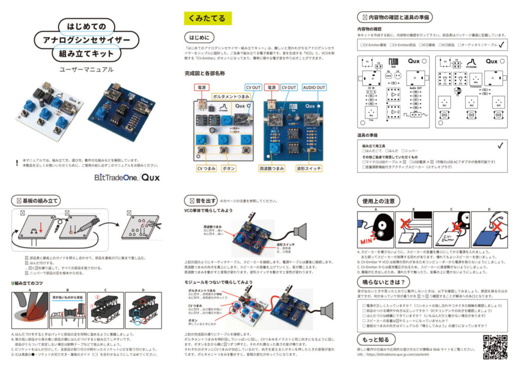回路動作原理や作り方を解説した分かりやすいマニュアルが付属、これからアナログシンセサイザーについて回路から理解を深めたい方にも最適です。