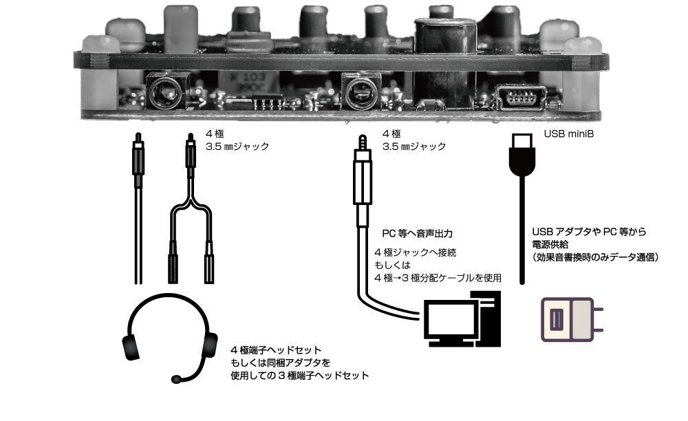 ~正常に効果音が出力されない場合~ 本製品の3.5mmジャック出力は4極CTIA方式です。 正常に音声が出力されるよう、下記の点をご確認ください。 ・PC等の入力ジャックが4極ジャックだった場合 -付属の4極ケーブルをご使用ください。 ・PC等の入力ジャックが3極ジャックだった場合 -4極→3極2本分岐ケーブル(別売)を使用してPC等へ入力してください。