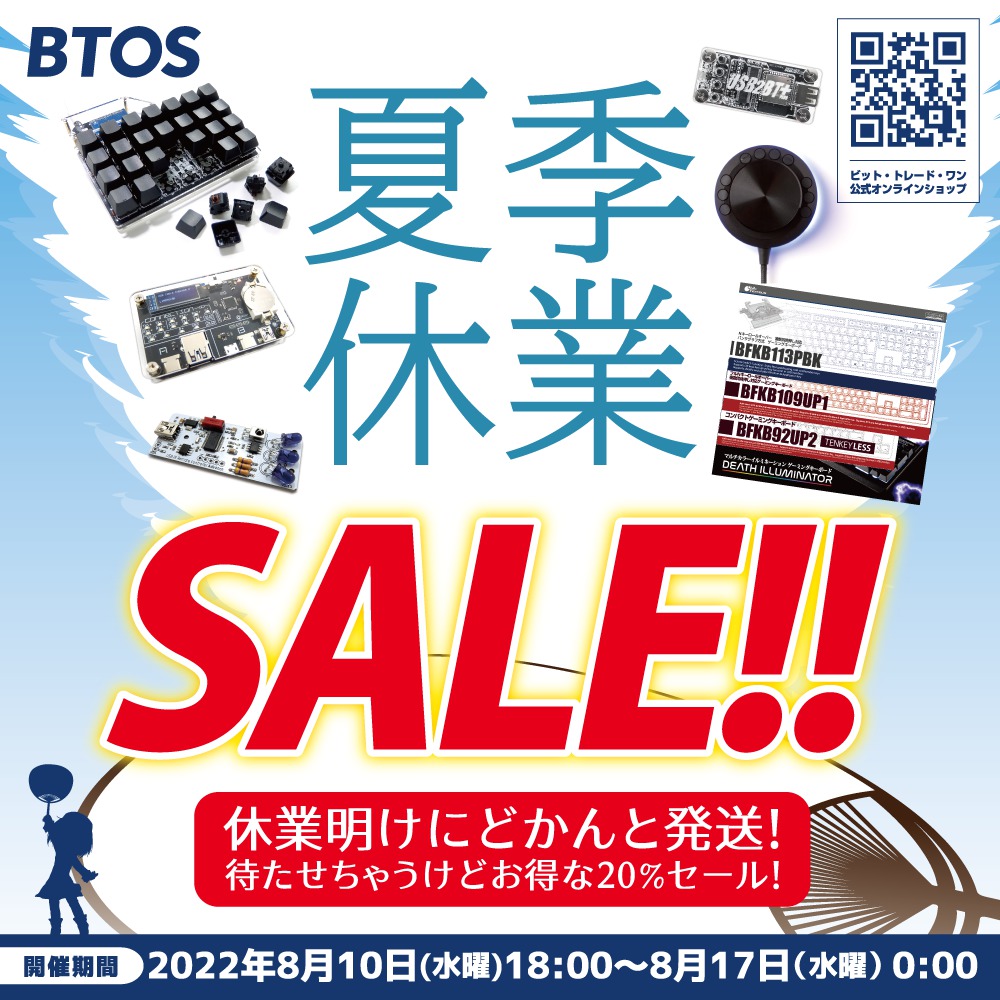 ビット・トレード・ワンは8/11~8/16まで夏季休業期間を頂いております。直販サイトも発送が止まってしまう中、皆様にお待たせしてしまう分を還元したい……!そんな形で、期間中20%オフにしちゃいます。