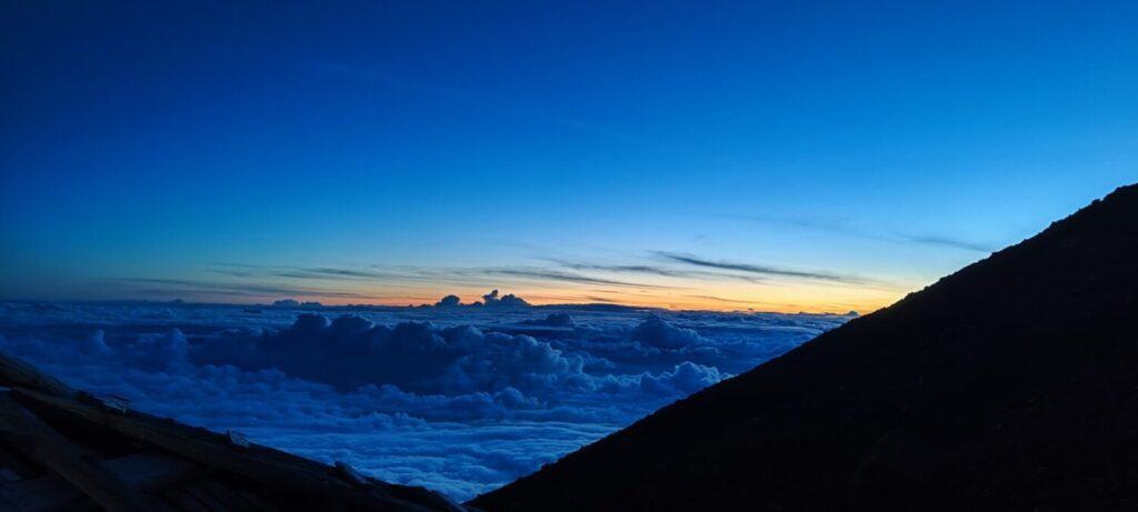 五合目時点で標高は既に雲の上。振り返ると雄大な景色。富士登山の醍醐味です。