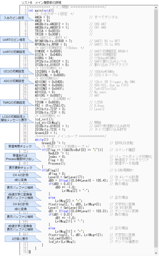 メインループの次は、タイマ2の割り込み処理で0.5秒ごとにセットされる表示フラグをチェックし、オンの場合には、チャネルAとチャネルBのレベルを計測し、液晶表示器の1行目にデシベル値で表示します。