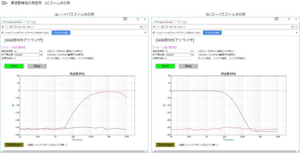 この接続状態で、パソコンやタブレットのブラウザに被測定装置の周波数特性をグラフ表示します。