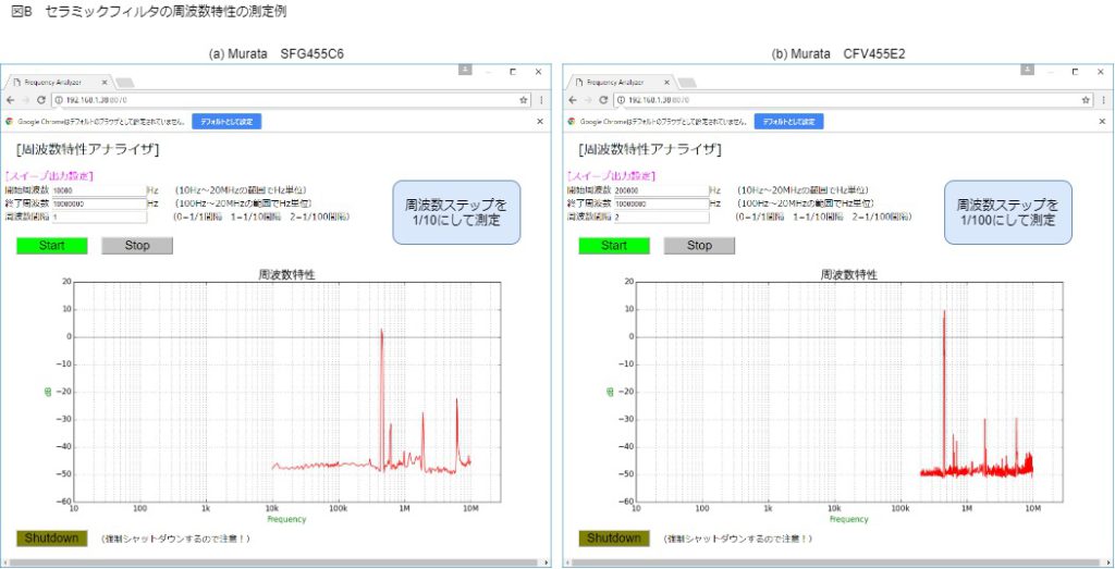 図Bは455kHzの中波ラジオ用のセラミックフィルタの特性を計測した例です。シャープできれいな特性であることが確認できます。このようなシャープな特性はスイープ周波数範囲を狭くして周波数可変ステップも1/10か1/100に細かくしないと正確な特性が得られません。