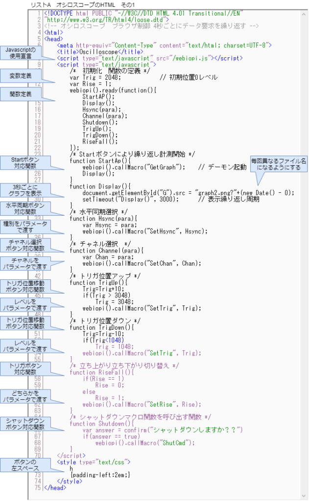 このページを実現したHTMLファイルのHeader部がリストAで、ここでボタンに割り付ける関数をJavascriptで記述しています。