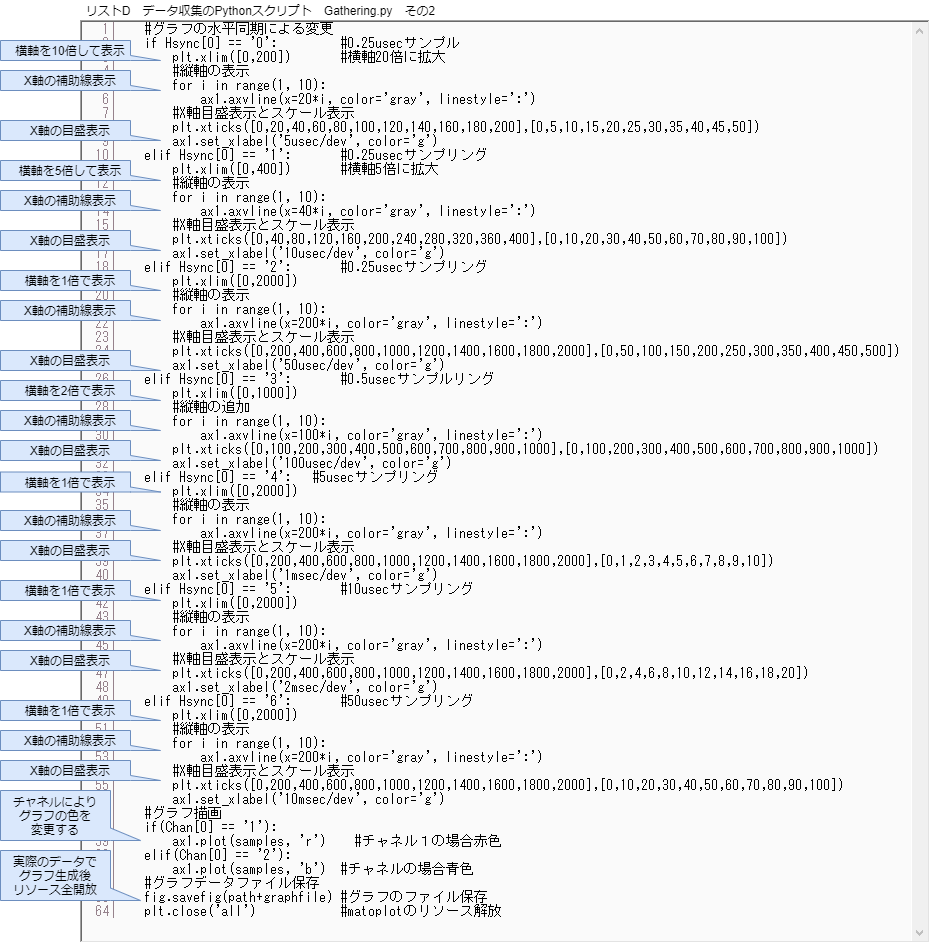 次がスクリプトの後半部でリストDとなります。ここでは横軸を表示させていますが、水平同期ごとに横軸の拡大率と目盛が異なることになりますから、それぞれに別々の表示設定となっています。横軸の拡大率を設定してからX軸の補助線を表示し、目盛を表示しています。