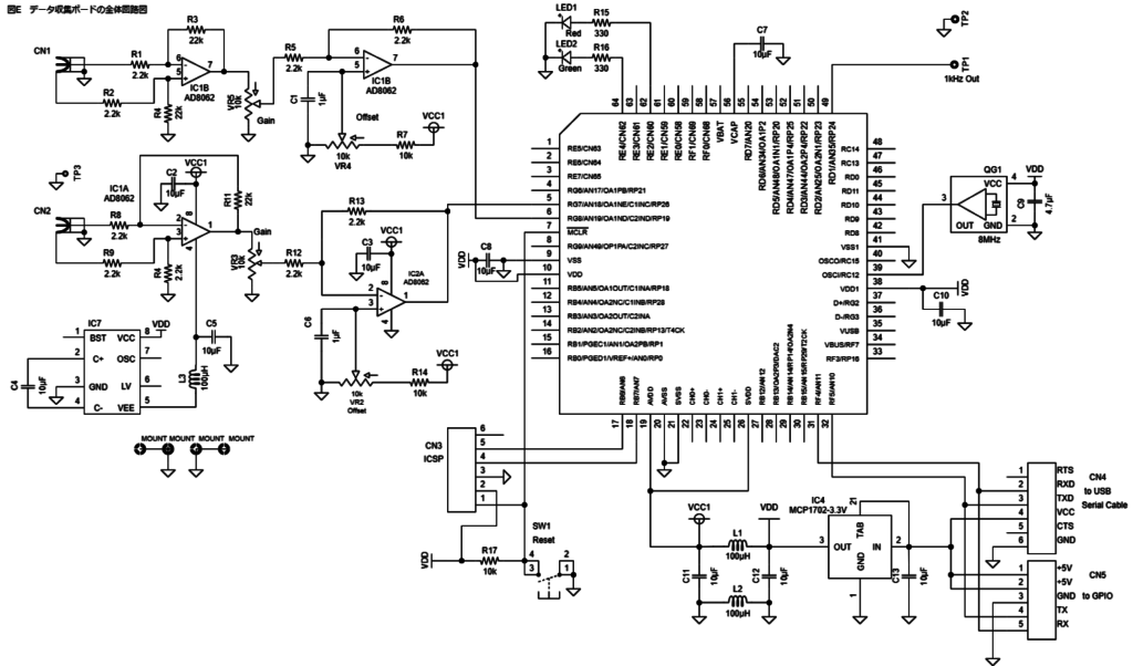 製作するデータ収集ボードの回路図は図Eのようにしました。