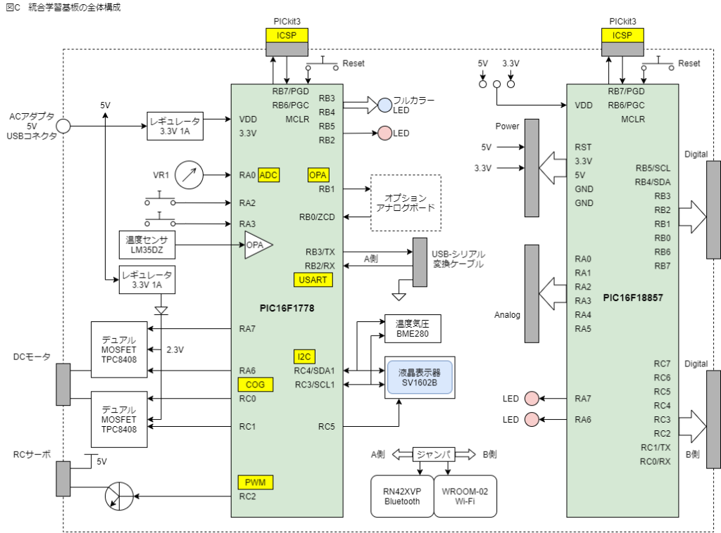 この2つのPICマイコンを使って統合学習基板の全体構成を図Cのようにしました。