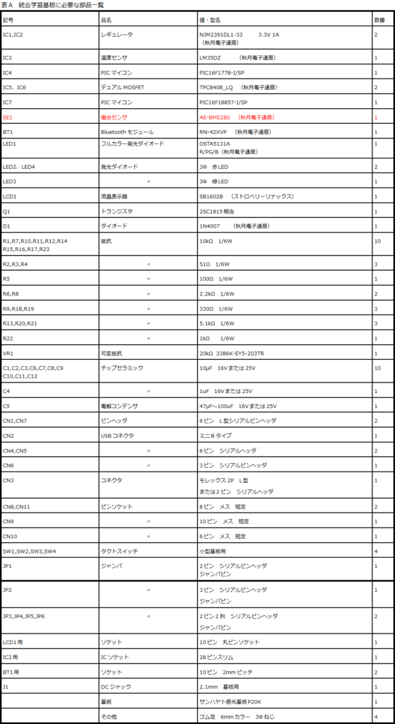 この基板組み立てに必要な部品は表Aとなります。
