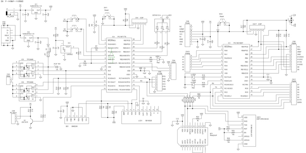 まず電源は図左側から、USBかDCジャックでDC5Vを入力するものとします。5V直接駆動のものが、Arduino互換用のPICマイコンとコネクタ、RCサーボ、温度センサとなります。あとはレギュレータで3.3Vを生成して供給します。