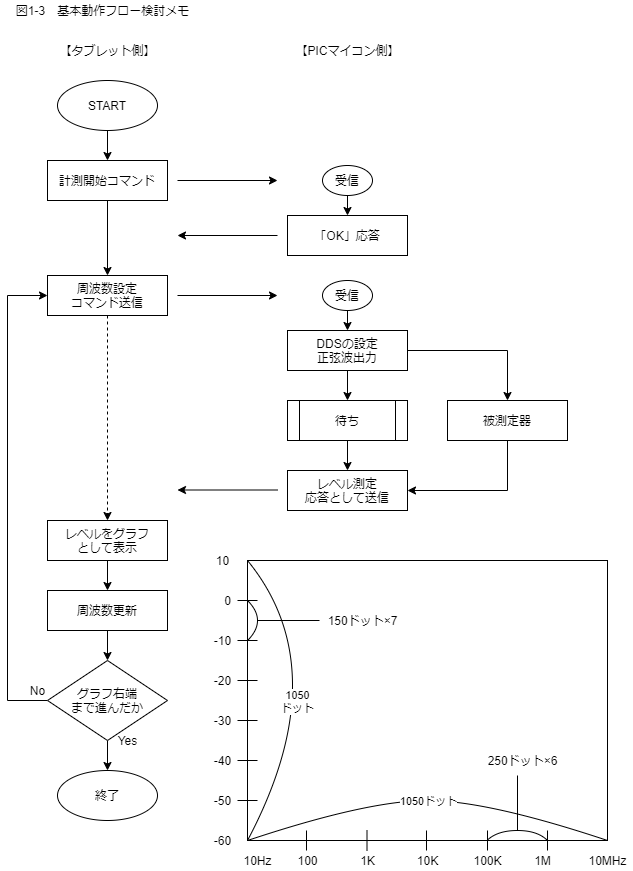 この周波数特性測定器では、タブレットのプログラムと計測器本体のPICマイコンのプログラムが互いにBluetoothでデータを送受しながら機能を実行しますが、周波数特性を測定する際のデータ送受は図1-3の検討メモのようにすることにしました。