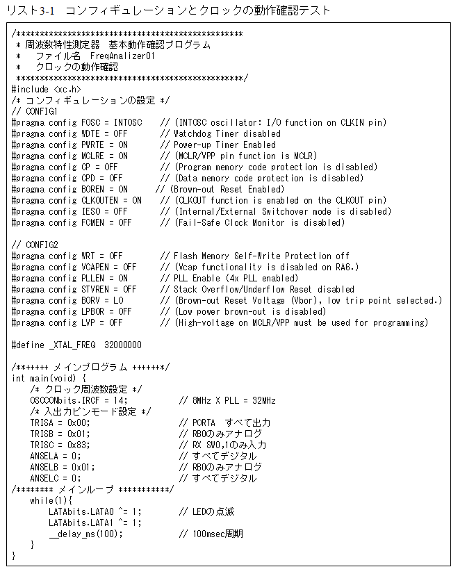 リスト3-1がRA0とRA1に接続されているLEDを0.1秒間隔で点滅だけをするプログラム「FreqAnalizer01」となります。このプログラムにより100msec周期でLEDが点滅すればコンフィギュレーションとクロックは期待通りになっていることが目で見てわかります。