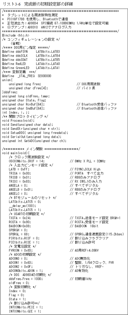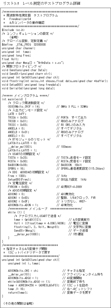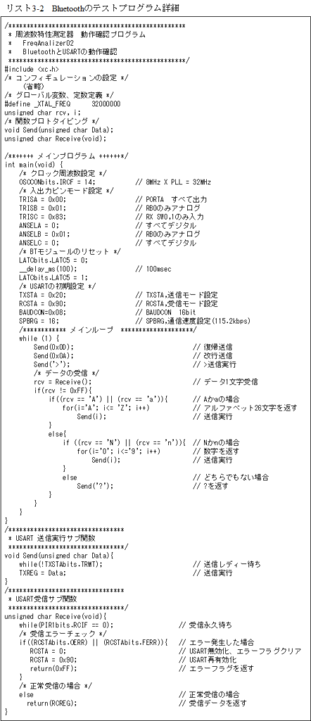 このテストを行うプログラム「FreqAnalizer02」がリスト3-2となります。このテストプログラムではUSARTの割り込みは使っていません。このUSARTの送受信関数は最終のアプリケーションでも使います。