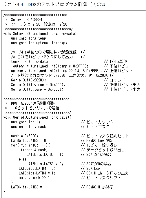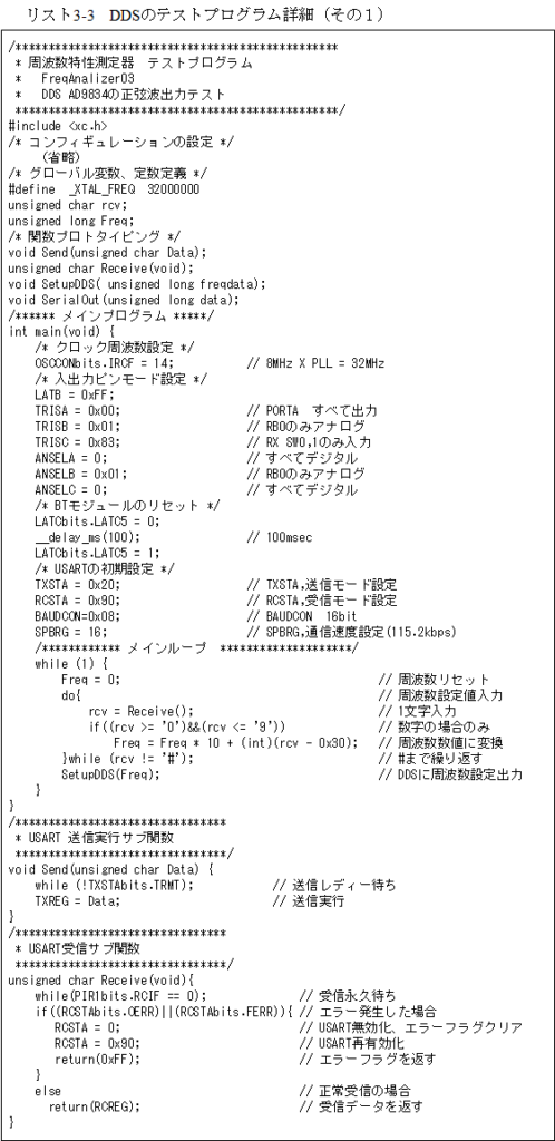 このテストプログラムの詳細がリスト3-5となります。USARTの初期設定後DDSには固定で1kHzの周波数が出力されるよう設定しています。