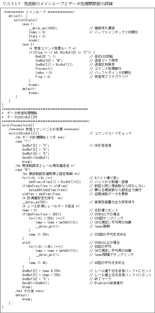 次がメインループ部と受信データ処理関数部の詳細でリスト3-7となります。