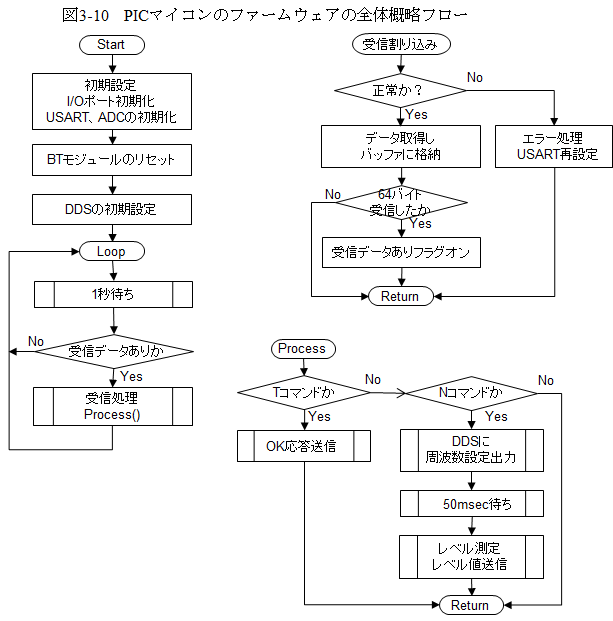 各部のテストがすべて完了しましたから、これらで製作した関数を使っていよいよ最終形態のアプリケーションを製作します。テストとは異なりBluetoothの受信をUSARTの割り込みで行うことにすると、PICマイコンのファームウェアの全体概略フローは図3-10のようになります。