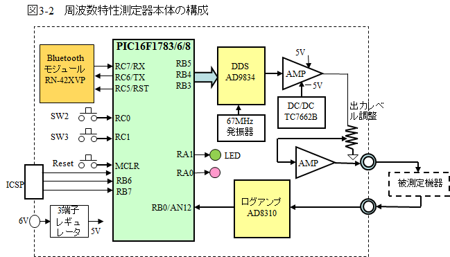 まず完成した周波数特性測定器本体の内部構成は図3-2のようになりました。この全体構成を基本にしてプログラムを製作していきます。PICマイコンの入出力ピンがポイントで接続されているものが区別されます。