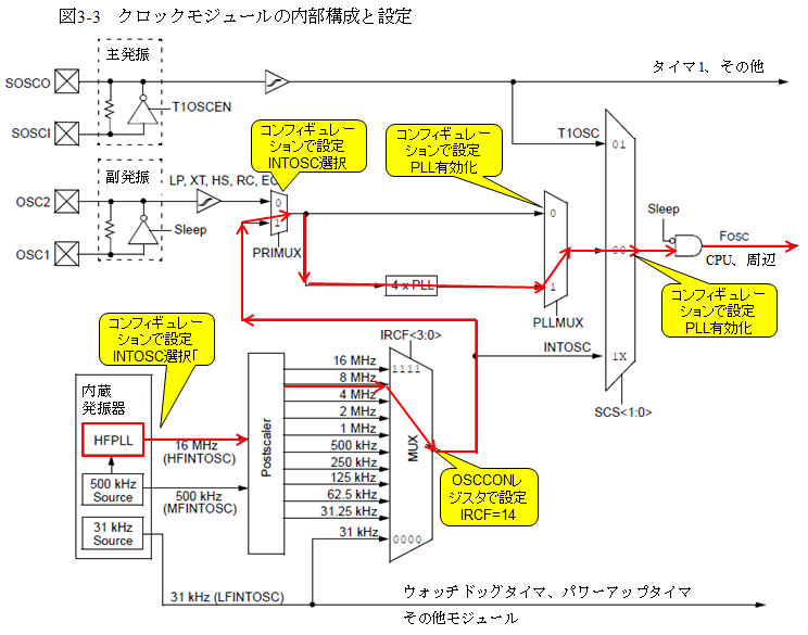 次がクロックの設定です。PIC16F1783/6/8/のクロック部の構成は図3-3のように少し複雑になっています。