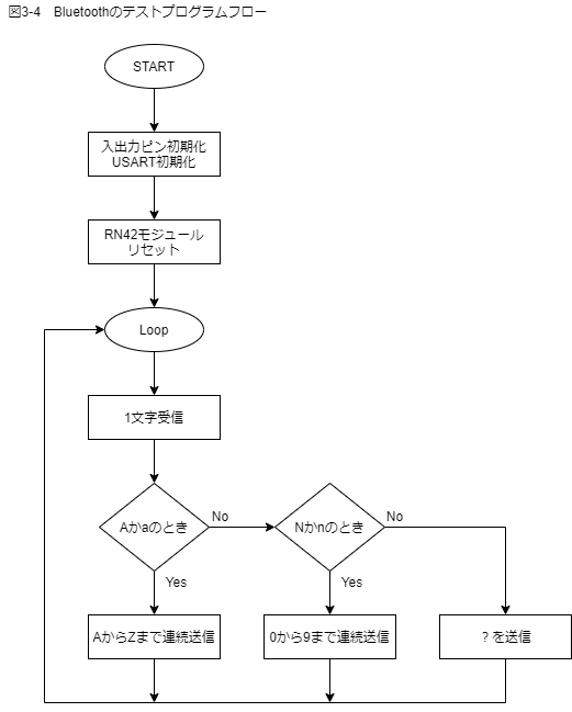 Bluetoothモジュールのテストプログラムは図3-4のような手順で行うものとします。入出力ピンとUSARTモジュールの初期設定後受信待ちに入り、受信した文字データが「A」か「a」の場合は、AからZまでの文字を送信し、受信文字データが「N」か「n」の場合は0から9までの文字を送信、どちらでもない場合は「?」を送信します。