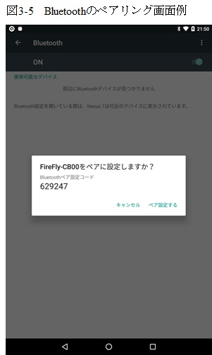 ペアリングはタブレットの「設定」アプリで行います。PICマイコン側の電源をオンにしてから、設定の中の「Bluetooth」をタップすると図3-5のような画面が開き、「使用可能なデバイス」欄に「FireFly-xxxx」(xxxxはMACアドレスの下位4桁でモジュールに印刷されている)があるはずです。