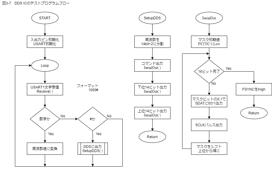 DDSに設定値を送信する関数SetupDDS( )とSerialOut( )は最終的にもそのまま使えるよう独立の関数として作成します。SerialOut( )関数では図2-2のタイムチャート通りにFSYNC、SDAT、SCLKをプログラムでHigh、Lowを制御することで出力しています。