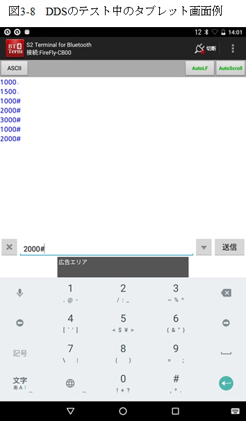 リスト3-3がメイン関数部で、初期設定のあと、USARTつまりBluetoothからの数字データを受信して周波数に変換してからDDSに送信することを繰り返しています。データの終わりを「#」文字で判定していますから、送信する場合は例えば「1000#」と送信すれば1kHzを設定することになります。リスト3-4のSerialOut( )関数がDDSにデータを送信するためのシリアル通信を実現する関数で、3ピンの信号をプログラムでHighとLowを制御して実現しています。実際に動作させているときのタブレット側の例が図3-7となります。ここでも「BT Term」というフリーソフトを使っています。