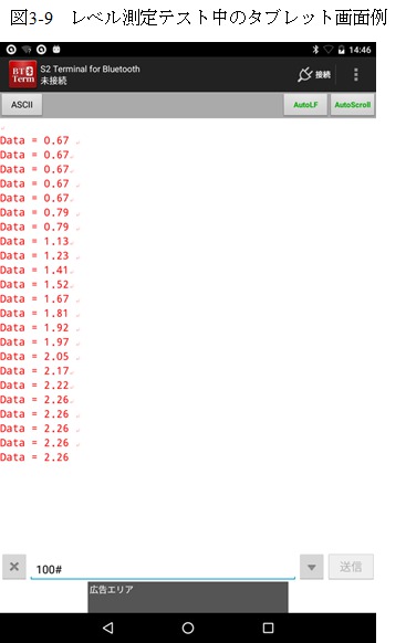 テスト中のタブレットの画面例が図3-9となります。正弦波出力のレベル調整用可変抵抗を回すと電圧値が変われば正常に動作しています。