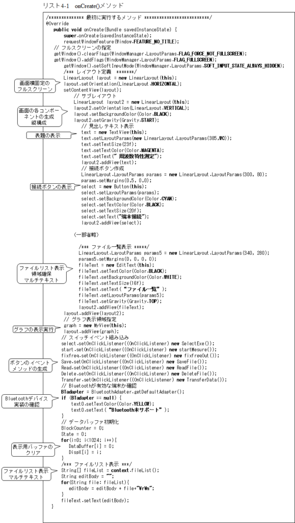 次がアクティビティが呼び出されたとき最初に実行するメソッドであるonCreate()メソッドでリスト4-1となります。