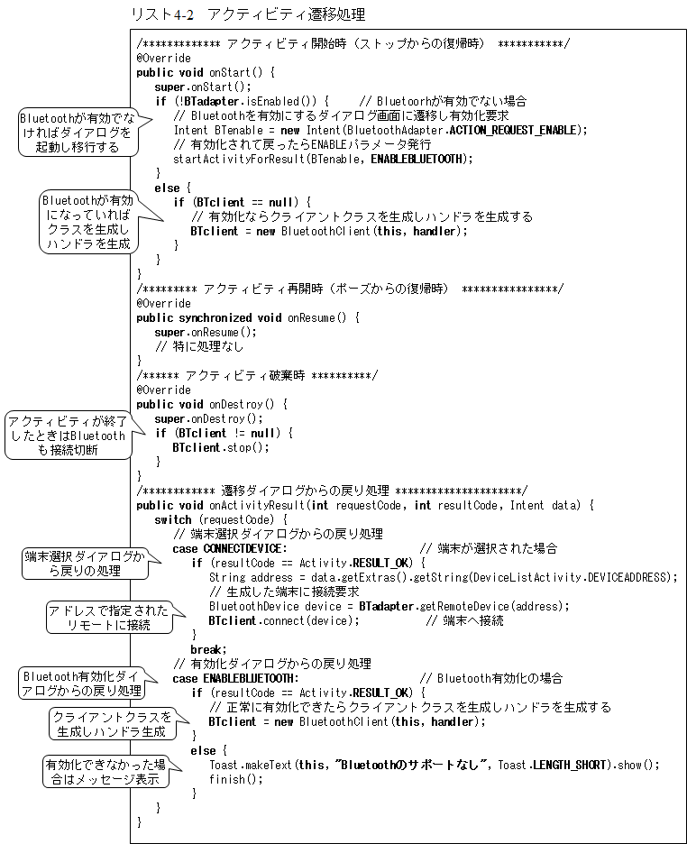 次が、アクティビティの状態遷移に伴う処理部でリスト4-2となります。ここではスタート時の処理が重要で、onStartイベント処理で、前節で説明したBluetoothが有効化されているかどうかのチェック処理を行っています。