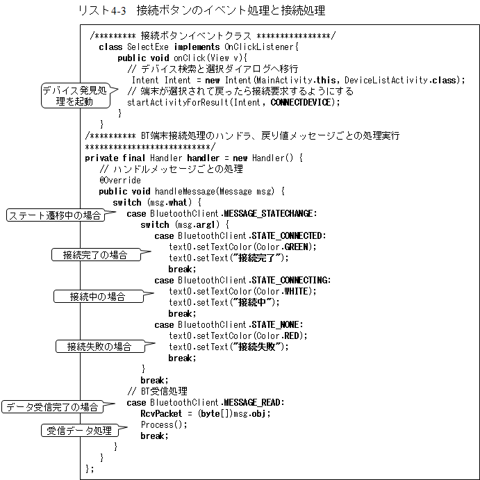 接続処理では、先の探索処理が継続中であれば探索を強制終了させます。また、すでに接続中であったり、転送中であったりした場合にはいったんそれらを中止し、改めて接続を開始するようにして同期化しています。この間の接続状態を呼び出し元アプリケーションに返すことで接続状態を表示できるようにしています。この接続状態表示は、メインアプリのハンドラで実行し、「接続待ち」→「接続中」→「接続完了」または「接続失敗」という流れで表示するようにしています。