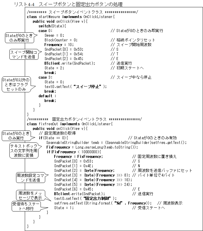 次がスイープボタンと固定出力ボタンのイベント処理部で、リスト4-4となります