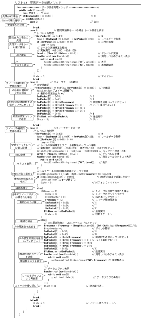 次が受信データ処理メソッドのProcess()メソッドでリスト4-5となります。ここですべての受信データ処理を実行しています。