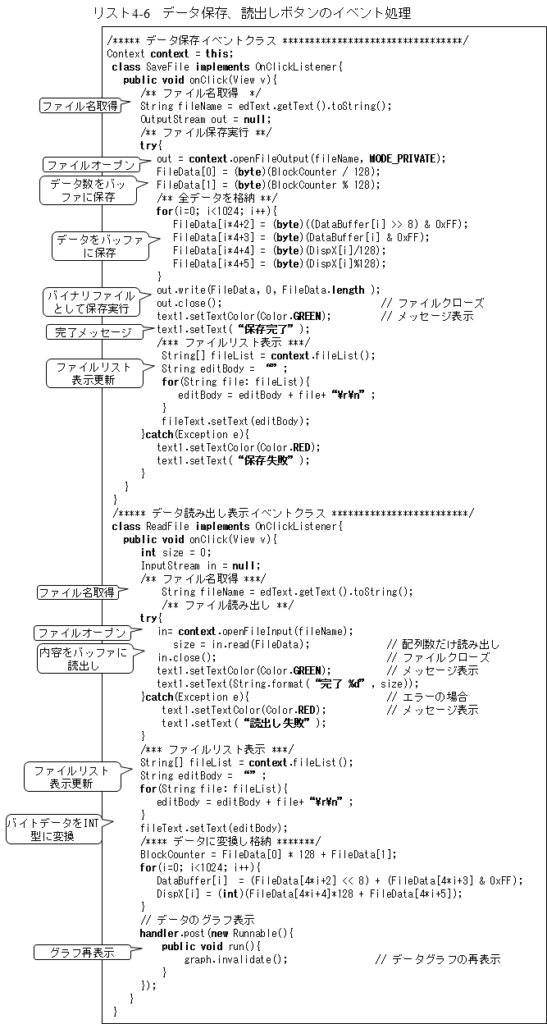 次が描画データの保存、読出し、削除のボタンのイベント処理部でリスト4-6となります。