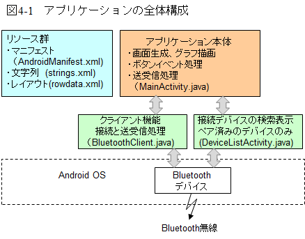 製作するアプリは図1-3のような流れで制御します。このアプリを実現するためにはBluetoothの送受信機能が必須になります。この通信機能はGoogleの開発者用サイトにある例題を参考にして製作することとし、全体を図4-1のような構成にしました。
