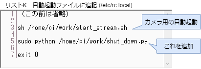 次にこのスクリプトを自動起動するように起動制御ファイル(/etc/rc.local)にリストKのように追記します。この起動制御ファイルは先にカメラ機能で追記したものと同じですから、その後にシャットダウン用の記述を追加します。