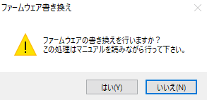 クリック後 以下のダイヤログが表示されます。”はい”を押すと模型電光基板はファームウェアアップデートのための特別なブートモードに入ります。以降は途中で電源を切ったり、USBケーブルを抜いた場合、基板が破損する恐れがあるため、Hexファイル(ファームウェア)をダウンロードしていないなど準備が整っていない場合は”いいえ”を押してブートモードを終了してください。