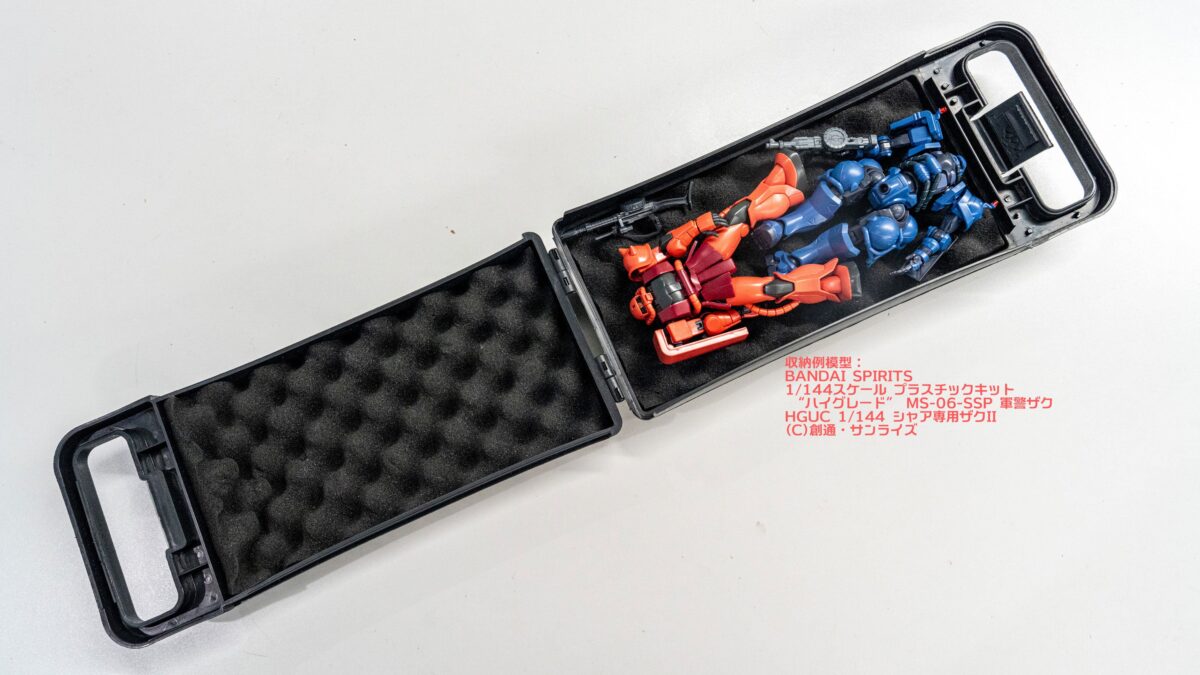キャリーハンドル付きのハードケース形状で、模型イベントへの搬入や、保管・移動に最適。1/144クラス相当の完成品模型なら2体の収納を想定しています。