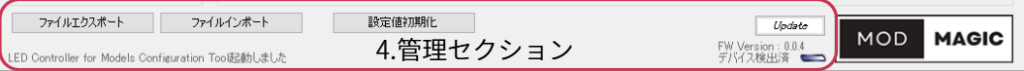 LED_Controller_for_Models_CTを起動し模型電光基板を接続を行ってください。MODMAGICロゴ左のデバイス検出を確認してください。