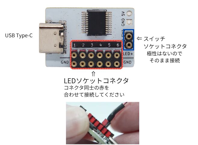 接続作業にあたっては通電中でもLEDユニットの抜き差しやソケットコネクタの差し込みを間違えてもLEDやスイッチが破損することはありませんのでご安心ください。複雑な作業の場合、光らせて確認しながらLEDユニットやスイッチ抜き差しの作業が可能です。間違えて接続しても光らないだけでLEDが壊れることはありません。