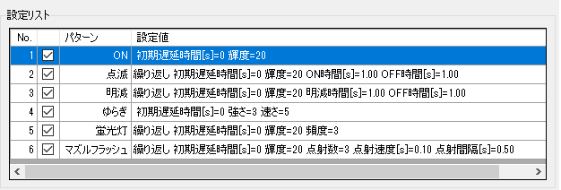 現在接続されている基板上に保存された各出力の設定値を表示しています。 No.1からNo.6まで各出力毎に設定されているパターン、設定値が表示されます。