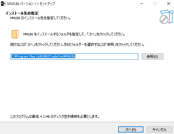 ”C:\Program Files (x86)\BitTradeOne\MMLB6”にフォルダが作成されインストールされます。