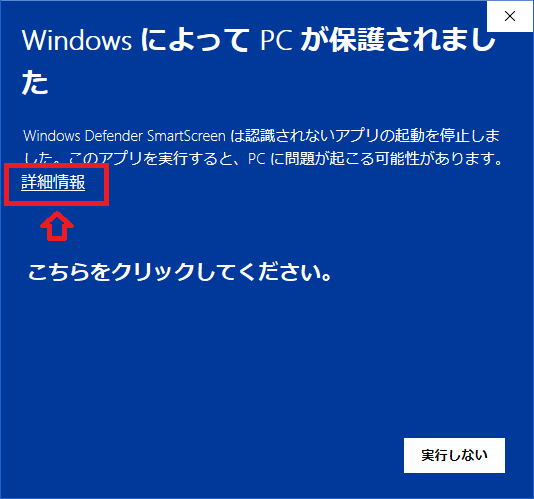 インストーラーを実行しようとするとはじめに「WindowsによってPCが保護されました」と記載された画面が表示されることがあります。