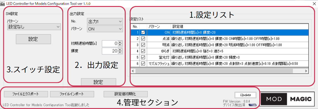 LED_Controller_for_Models_CTを起動し模型電光基板を接続を行ってください。MODMAGICロゴ左のデバイス検出を確認してください。
