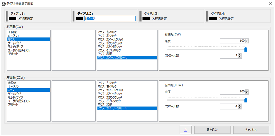 画面の例:ダイアルにマウスホイールを割り当てました。右回転スクロール数を1(プラス)にセットし上方向のスクロール、左回転には-1(マイナス)をセットし下方向のスクロールを行っています。