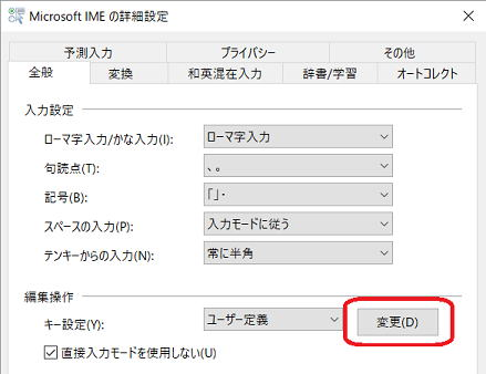[画面右下の日本語入力のアイコンで右クリック] – [プロパティ] – [詳細設定] – [変更]