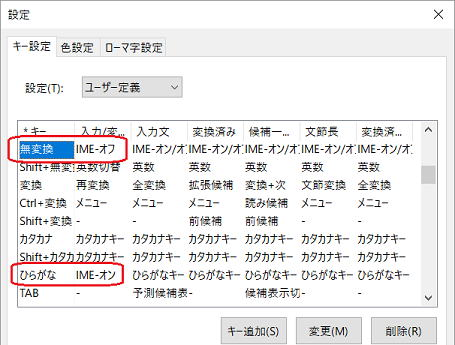 [無変換] – IMEオフ、[ひらがな] – IMEオン