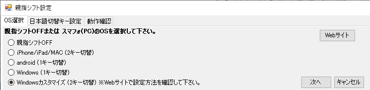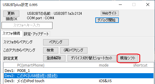 USB2BTplus設定アプリで[親指シフト]ボタンを押す