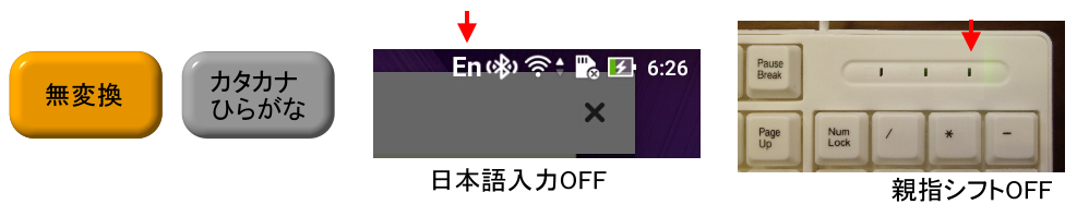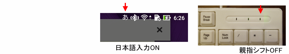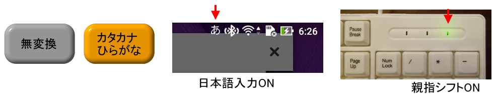 日本語入力と親指シフトのON/OFFがずれる場合があります、キーを繰り返し押して下さい。