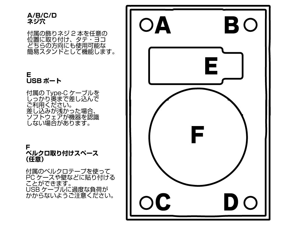 【内容物】USBケーブル(A to C)、ベルクロテープ、スタンド用飾りねじ